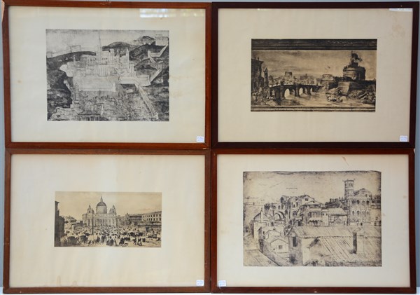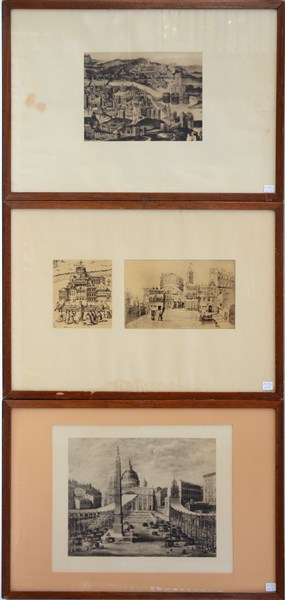 Gruppo di sette stampe di misure diverse raffiguranti vedute romane. In cornici