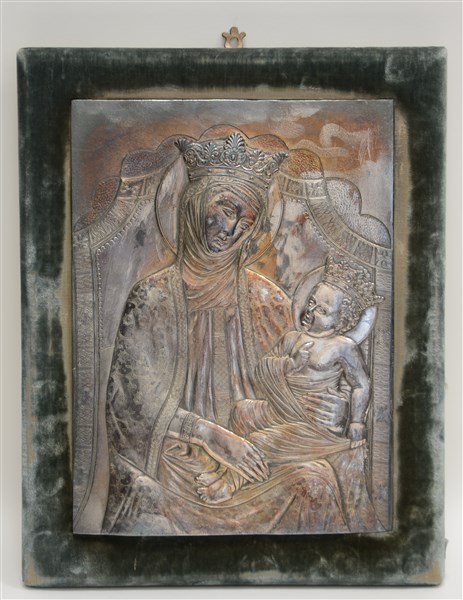 Bassorilievo in argento raffigurante la Madonna con bambino (cm 34,5x26) firmata R Luca, applicata su pannello in velluto (difetti)