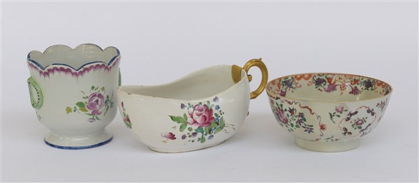 Manifatture diverse, secolo XVIII/XIX. Lotto composto da un versatoio, un piccolo cachepot ed una ciotola in maiolica e porcellana decorate a fiori in policromia (gravi difetti e restauri)