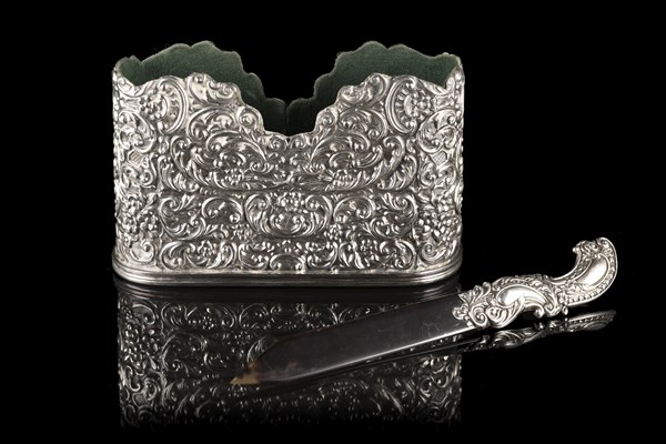 Portalettere con taglia carte in argento sbalzato a fiori e lama in finta tarta