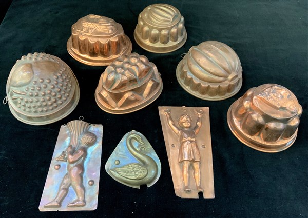 Lotto composto da nove forme da budino in rame sbalzato a frutta, figure e animali (difetti)