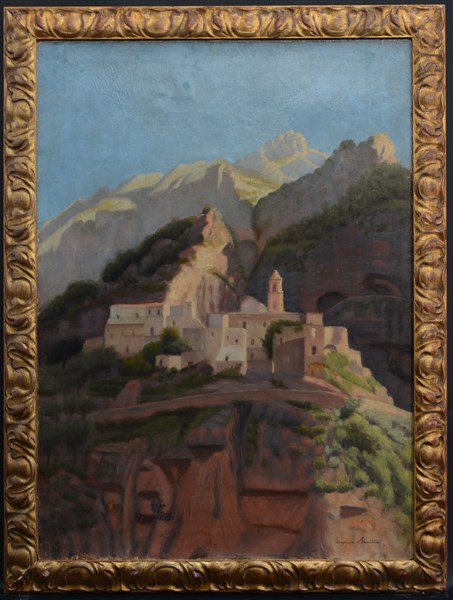 Eugene Muiller "Paesaggio montano con paesino" olio su tela (cm 80x60) firmato