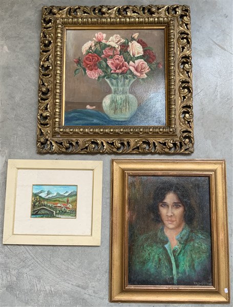 Lotto di tre dipinti ad olio raffiguranti ritratto femminile, un vaso di fiori e un paesaggio montano, autori e misure diverse, in cornici (difetti)