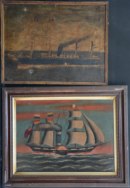 F. Doorway "Veliero a vapore ecorock" olio su rame (cm 50x65) firmato e datato 1889 in basso a sinistra, unito ad un'altro dipinto ad olio su tela raffigurante un altro veliero a vapore
