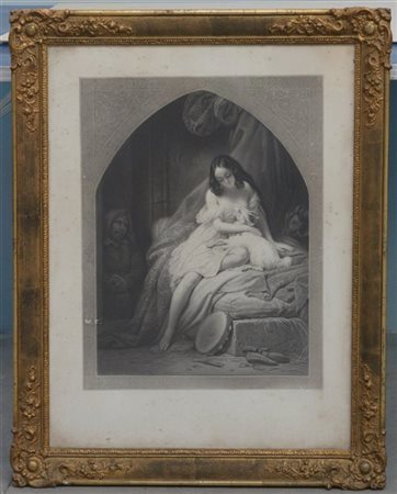 Incisione del secolo XIX raffigurante fanciulla con capretta (cm 60x80) In cornice in legno intagliato e dorato (difetti)