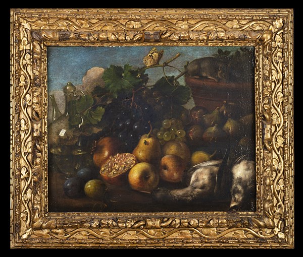 Scuola del secolo XIX "Natura morta con frutta, farfalla, topolino e volatile" olio su tela (cm 38,8x49) In cornice (lievi difetti)