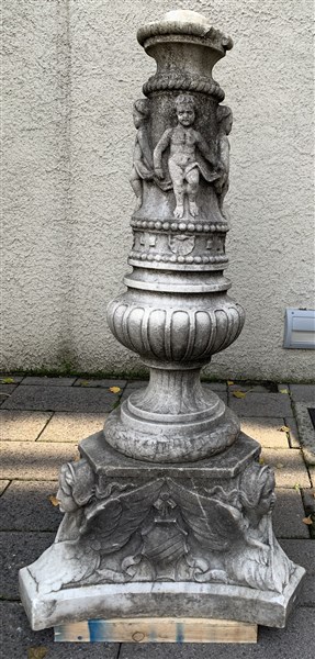 Fontana in marmo decorata a cherubini nella fascia, base a colonna con putti poggiante su supporto scolpito a figure alate e stemmi nobiliari (h cm 135) (difetti e mancanze)
