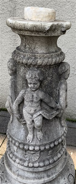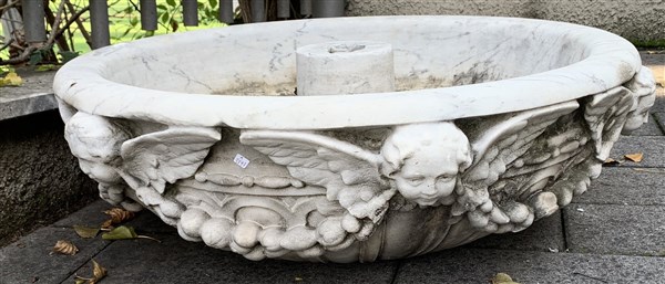 Fontana in marmo decorata a cherubini nella fascia, base a colonna con putti po