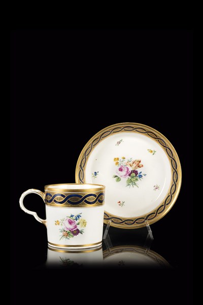 Manifattura di Vienna, secolo XIX. Tazza con piattino in porcellana profilata in blu e oro e decorata con fiori in policromia, marca di fabbrica alla base (difetti)
