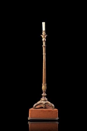 Candeliere in legno intagliato e dorato con fusto a colonna scanalata terminante in tre piedi mossi, intagliato e laccato a motivi geometrici. Inizio secolo XIX (h. cm 123) Montato a luce elettrica in epoca posteriore (difetti e rotture)