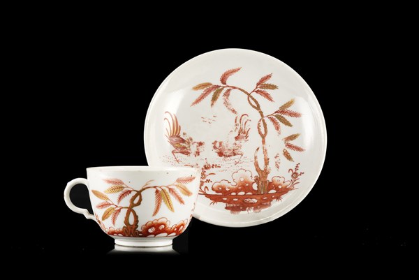 Manifattura di Ginori, Doccia, secolo XVIII. Tazza con piattino in porcellana, decoro a galletto in rosso fuoco e dorature (difetti)
