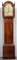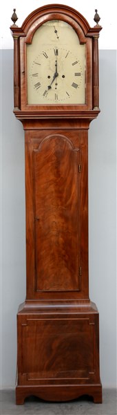 Orologio a torre di struttura architettonica, fronte ad un'anta lastronato in piuma di mogano, parte superiore con anta a vetri decorati con colonne laterali scanalate e pinnacoli in metallo. Quadrante dipinto su fondo bianco con a numeri romani e quadrantini per i secondi e giorno del mese cimasa con quadrantino selettore della suoneria. Movimento con carica settimanale suoneria delle ore su campanello (cm 47x220x24) (difetti)