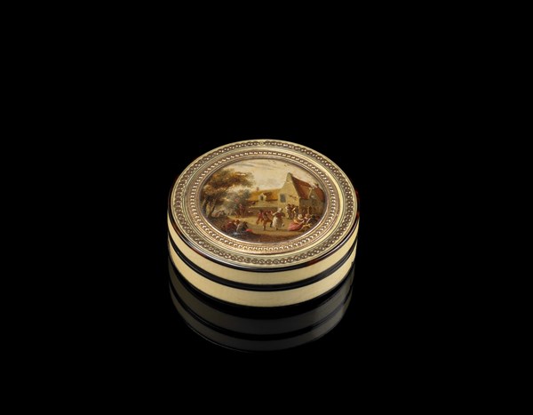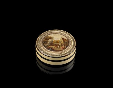 Tabacchiera in tartaruga ed avorio decorata sul coperchio da miniatura raffigurante festa fiamminga entro cornice in metallo dorato e perlinature. Secolo XIX (d. cm 6,5) (difetti e mancanze)