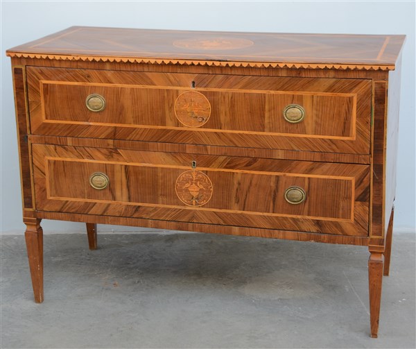 Cassettone lastronato e filettato in legno chiaro. Fronte, fianchi e piano centrati da medaglione intarsiato a vaso fiorito con volatili. Lombardia, secolo XVIII (cm 120x86x55,5) (difetti e restauri)