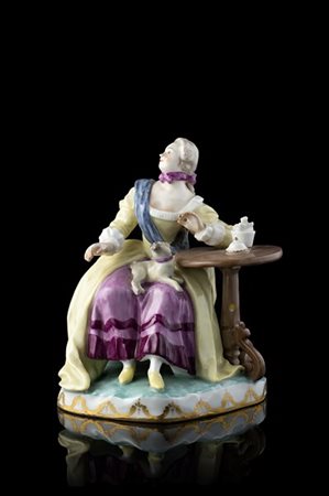 Manifattura di Vienna, secolo XIX. Gruppo in porcellana policroma raffigurante gentildonna con cagnolino, marca di fabbrica alla base (h. cm 15) (difetti)