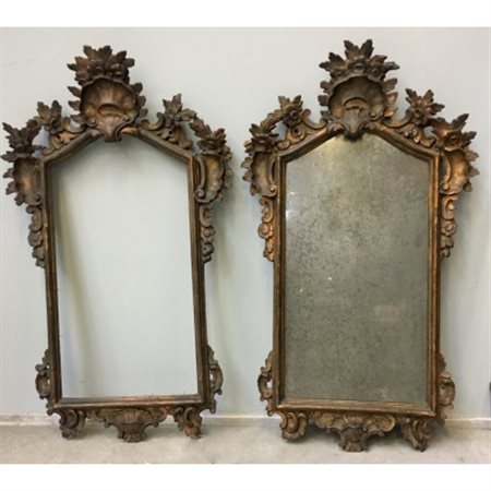 Coppia di specchiere in legno intagliato e dorato a volute fogliate e fiori (cm 90x50) Inizio secolo XIX (difetti, una mancante di specchio)