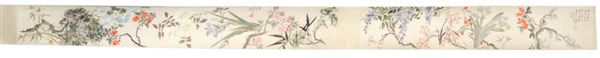 Quattro dipinti raffiguranti le quattro stagioni, con iscrizione calligrafica, inchiostro e colore su carta, montati come scroll orizzontale