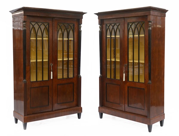 Coppia di vetrine Impero a due ante lastronate in radica con profili e listelli ebanizzati decorate da montanti a sfinge in legno ebanizzato e in bronzo. Piedi rastremati. Secolo XIX (cm 123x181x44) (difetti)