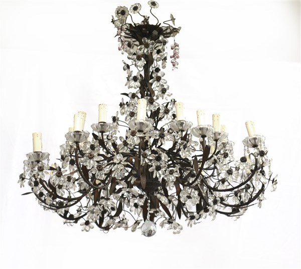 Grande lampadario a 24 fiamme in metallo a "ramage" con putti e coppe in cristallo (h cm 90) (difetti e mancanze)