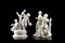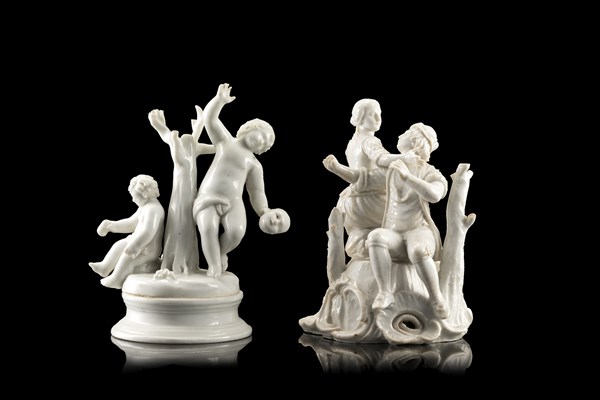 Manifattura veneta, fine secolo XVIII - inizio secolo XIX. Due gruppi in porcellana bianca raffiguranti scena galante ed allegoria con putti (h. max cm 12) (difetti e mancanze)
