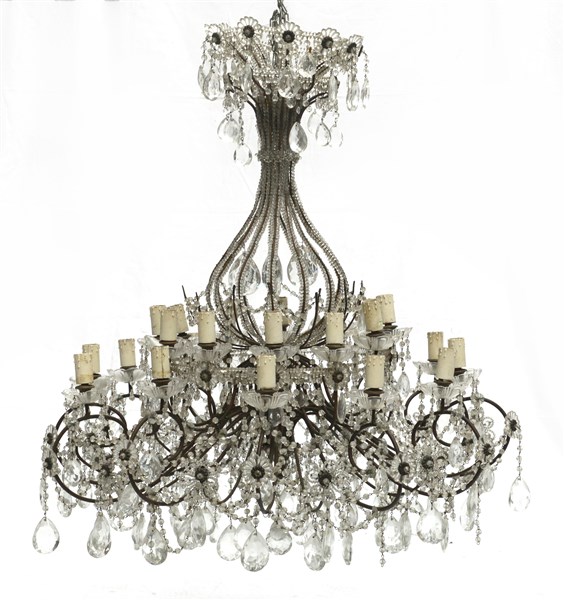 Grande lampadario a 24 fiamme decorato a fiori, catene e perlinature con pendagli in cristallo (h cm 100) (difetti e mancanze)
