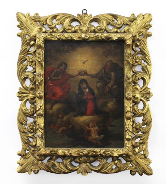 Scuola lombarda del secolo XVII "Incoronazione della Vergine" Olio su tela (cm 53x39,5) In cornice antica in legno intagliato e dorato (difetti e restauri)