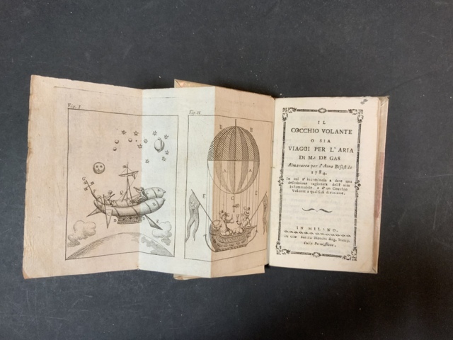 [AEROSTATICA] [BIANCHI Romualdo] Il cocchio volante o sia viaggi per l'aria. Milano: Bianchi, 1784. 16mo, una tavola ripiegata. Legatura coeva in brossura colorata. Raro testo che descrive i successi dei fratelli Montgolfier corredato da una bella tavola. Non collazionato e difetti da esaminare.