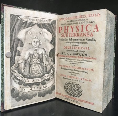 BECHER J. J. (1635-1682) Physica subterranea. Lipsia: J.L. Gleditsch, 1703. 8vo, antiporta, frontespizio in rosso e nero (bruniture diffuse). Mezza pelle coeva, piatti in cartone verde marmorizzato (sfregato). Non collazionato e difetti da esaminare.