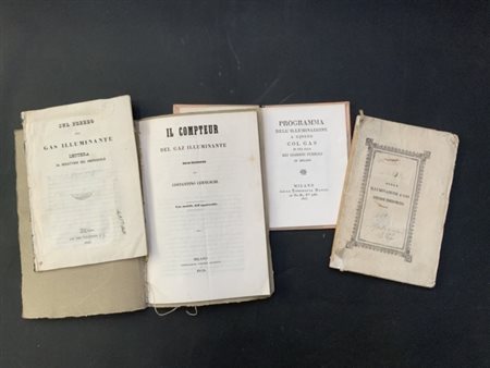 [GAS]. Una serie di interessanti opuscoli sull'argomento: PREDIERI PAOLO. Sulla Illuminazione a Gas. Istruzione teorico-pratica ad uso di qualunque persona che ami conoscere questa moderna industria. Terza edizione, riveduta dall'autore. Bologna, pei tipi di Jacopo Marsigli, 1847. - Sul prezzo del Gas Illuminante. Milano: Valentini, 1856. - CERNUSCHI, Costantino. Il Compteur del Gaz Illuminant. Milano. Pietro Agnelli, 1851. - Programma dell'Illuminazione a giorno col Gas in una sala dei Giardini Pubblici di Milano. Milano: Manini, 1825. Non collazionato e difetti da esaminare.