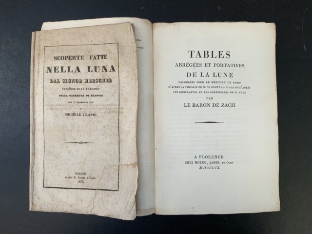 [LUNA]. Un lotto di due libri interessanti che riguardano la luna: ZACH, Le Baron de. Tables abrégées et portatives de la Lune. Firenze: Molini, Landi, 1809 - Michele CLAPIE. Scoperte fatte nella luna dal Signor HERSCHEL. Torino: G. Pomba, 1836. 2 opere in 2 volumi, 8vo. La prima opera con numerose tabelle, l'errata, legata in carta coeva marmorizzata; la seconda in brossura originale stampata in nero (alcune fioriture e macchie di umidità più evidenti alla seconda opera). Non collazionato e difetti da esaminare.