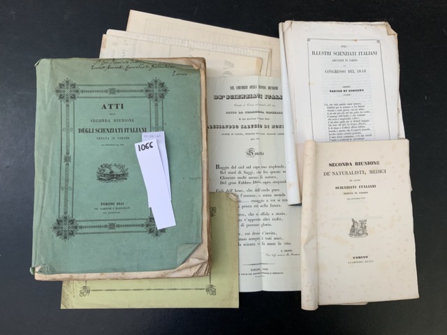 [SCIENZIATI ITALIANI]. Un lotto di libri contenente la gli Atti della Seconda Riunione degli scienziati italiani tenuta in Torino. Torino: Cassone e Marzorati, 1841. 4to, grande tavola incisa in rame. Brossura editoriale verde stampata in nero. Insieme ad alcuni degli atti ufficiali del congresso, il memorando dell'evento un estratto degli annali della Reale Società Agraria e alcuni altri opuscoli. Non collazionato e difetti da esaminare.
