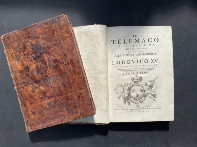 CARSELLI Flaminio. Il Telemaco in ottava rima tratto dal francese e dedicato alla Maestà' Cristianissima di Lodovico XV. Roma: De Rossi, 1747. 4to, antiporta allegorica al primo volume, vignette con i gigli di francia ai frontespizi, legatura coeva in piena pelle con titoli e decori in oro al dorso e tagli a spruzzo. Prima traduzione italiana della celebre opera epico pedagogica di Fenelon. Non collazionato e difetti da esaminare.