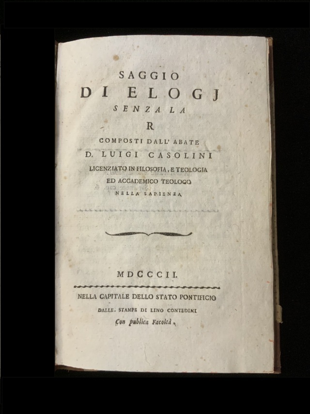 CASOLINI, Luigi. Saggio di elogj senza la r composti dall'abate d. Luigi Casolini licenziato in filosofia, e teologia ed accademico teologo nella sapienza. Nella capitale dello stato pontificio e nella capitale della Toscana: Giuseppe Fantosini, 1802. 8vo, mezza pelle coeva, piatti in carta decorata e tagli decorati. Non collazionato e difetti da esaminare.