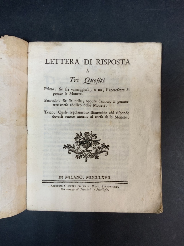 [ECONOMIA] Lettera di risposta a tre quesiti primo. Se sia vantaggioso, o no, l'accrescere di prezzo le monete. Secondo. Se sia utile, oppure dannoso il permettere corso abusivo delle monete. Terzo. Quale regolamento stimerebbe chi risponde doversi tenere intorno al corso delle monete. Milano: Galeazzi, 1767. 4to. brossura coeva. Raro e interessante trattato anonimo vicino alle idee illuministe di Pietro Verri che sostiene la dannosità di una politica economica deflattiva causata dall'accrescimento del valore della moneta. [Completo]