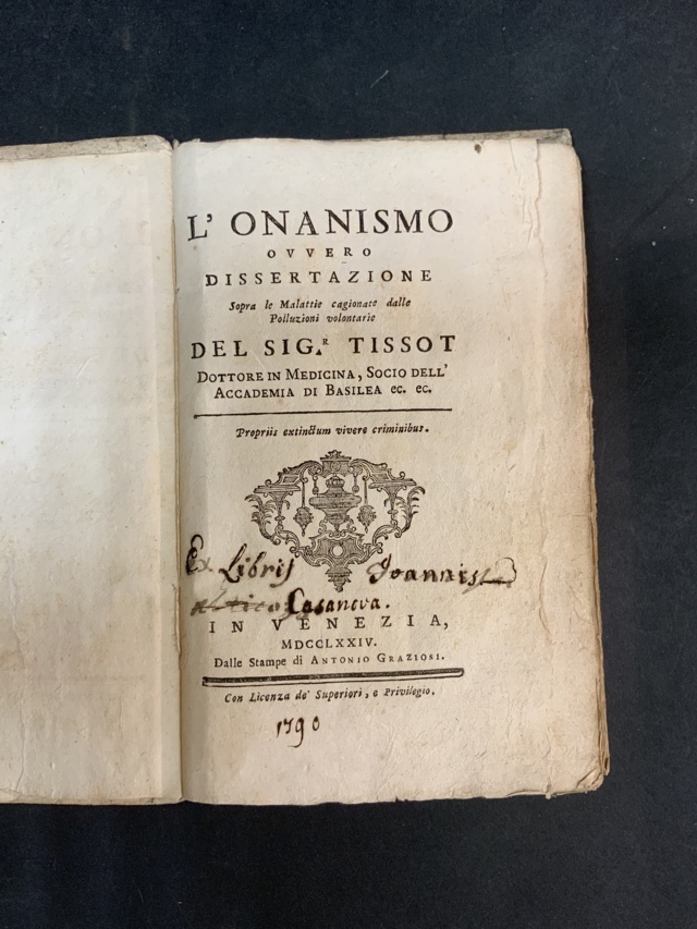 [EROTICA - CASANOVA]. TISSOT, Samuel Auguste. Lonanismo, ovvero dissertazione sopra le malattie cagionate dalle polluzioni volontarie. Venezia Antonio Graziosi: 1774. 8vo, legatura coeva in cartonato coevo, ex libris di Joannis Casanova, probabilmente il fratello pittore del più famoso Giacomo. Non collazionato e difetti da esaminare.