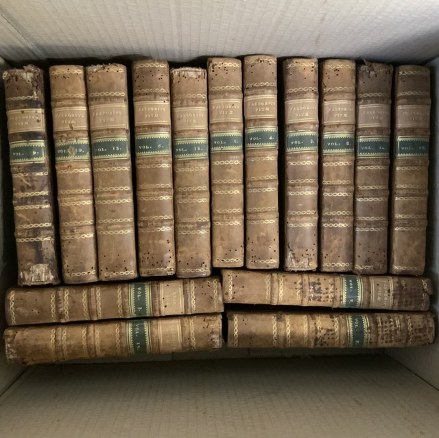 FABRONI Angelo. Vitae Italorum doctrina excellentium qui saeculis XVII et XVIII floruerunt. Pisa: Ginesi- Mugnaino, 1778-1792. 15 voll (su 20), 8vo, Legature coeva in piena pelle con titoli in oro su tasselli al dorso, tagli rossi (qualche difetto). I primi 15 volumi di questa ambiziosa opera elogiativi dei "geni italiani" degli ultimi due secoli (in cartone). Non collazionato e difetti da esaminare.