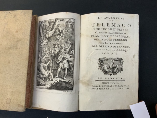 FÉNELON, François de Salignac de la Mothe. Le avventure di Telemaco Figliuolo d'Ulisse. Venezia: 1768. 2 volumi in 8vo, bella copia in cartone coevo, tagli a spruzzo, numerose illustrazioni fuori testo e una mappa ripiegata. Non collazionato e difetti da esaminare.