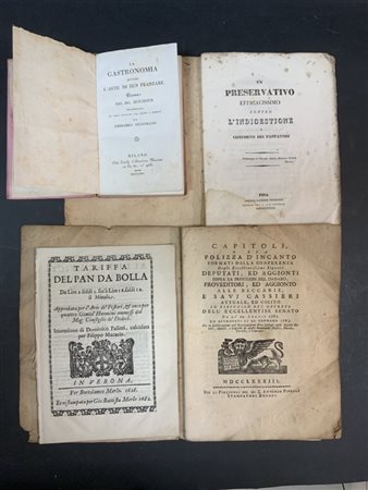 [GASTRONOMIA] Lotto di 4 edizioni antiche: BERCHOUX. La Gastronomia ovvero l'arte di ben pranzare. Milano: Manini, 1825. [s.e] Un preservativo efficacissimo contro l'indigestione a conforto dei pappatori. Pisa: Ranieri Prosperi, 1832; e due editti per il calmiere dei prezzi della Repubblica veneta tra cui si segnala la Tariffa del pan da Bolla, stampato a Verona nel 1682. Non collazionato e difetti da esaminare.