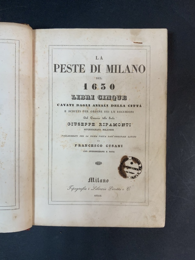 [MILANO] RIPAMONTI Giuseppe. La peste di Milano del 1630. Milano: Pirotta, 1841. 8vo grande; bella legatura del tempo in mezzo marocchino con titoli e fregi in oro al dorso. Non collazionato e difetti da esaminare.