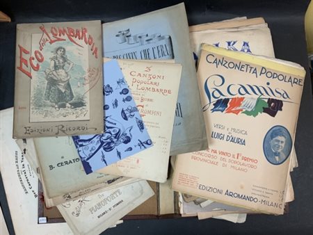 [MUSICA] Spartiti di musica popolare e non, di fine Ottocento fra cui alcuni spartiti e altri album illustrati. Interessante la presenza di numerose opere in dialetto meneghino. Non collazionato e difetti da esaminare.