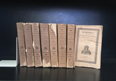 [NAPOLEONICA - MEMORIE] GOURGAUD G., MONTHOLON C. T.. Mémoires pour servir à l'histoire de France, sous Napoléon, écrits à Sainte-Hélène. Parigi: Firmin Didot 1823. 8 vol, 8vo. 8 carte di facsimile, 8 carte geografiche e 2 tabelle più volte ripiegate. Brossura editoriale con piatti stampati (fioriture e difetti alla legatura). Prima edizione di questa importante e celebre fonte per la storia napoleonica. Le memorie furono dettate da Napoleone ai generali Gourgaud e Montholon che seguirono l'Imperatore nell'esilio di Sant'Elena. A differenza di Las Cases, mosso quasi certamente più da motivi editoriali, i due fedelissimi scrissero le memorie animati dalla più fanantica dedizione che li avevi portati fino all'ultimo a fare pressioni per la liberazione dell'Imperatore. Non collazionato e difetti da esaminare.