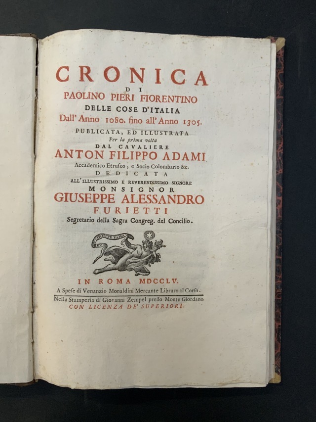PAOLINO PIERI. Cronica...delle cose d'Italia dall'anno 1080 all'anno 1305. Roma: Monaldini, 1755. Folio, frontespizio stampato in rosso e nero. Legatura del XIX secolo con dorso in pelle e titolo manoscritto. Non collazionato e difetti da esaminare.