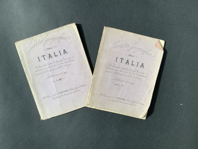 [CARTOGRAFIA - FERROVIE] Carta geografica dell'Italia indicante tutte le strade ferrate in esercizio... Milano: Genevresi, 1878. (1170 x 910 mm) 2 parti ripiegate entro brossura stampata coeva. Curiosa mappa delle vie di trasporto esistenti nell'Italia postunitaria. Non collazionato e difetti da esaminare.