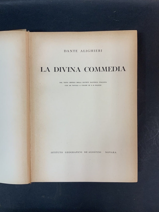 DANTE. La Divina commedia. Novara, De Agostini, 1943. 105 tavole a colori di G.B. Galizi (Unito:) Commento alla Divina Commedia illustrato da Galizi. Milano, 1943 2 voll. in-folio; legature editoriali.