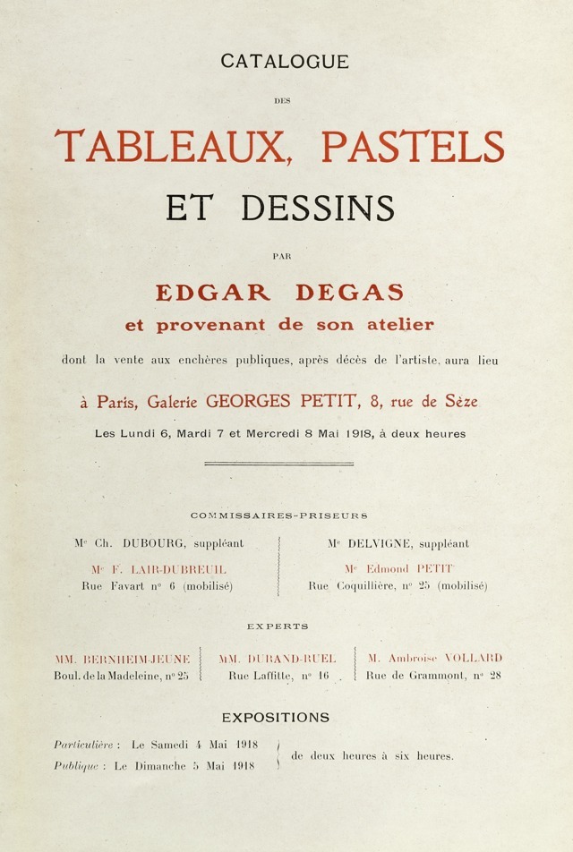 DEGAS, Edgar (1834-1917) - Catalogue des Tableaux, Pastels, et Dessins. [Volumi I-IV contenenti la 1re, 2me, 3me e 4me e dernier vente). [Insieme a:] Catalogue des Eaux-Fortes, Vernis-mous, acqua-tintes. Paris: Galerie Georges Petit, 1918-1919. Rara serie di cataloghi delle celebri vendite parigine della collezione di oggetti di Edgar Degas. 5 volumi, 8vo (275 x 190mm). Titoli in rosso e nero, numerosissime immagini (lievi tracce di polvere, tracce di umidità al catalogo delle stampe). Brossure originali (lievi difetti più marcati al catalogo della seconda vendita). Nel lotto anche Exposition Degas (1924).