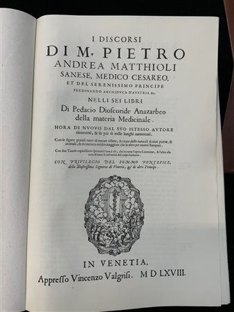 [FACSIMILE] I discorsi di M. Pietro Andrea Matthioli Sanese, Medico Cesareo facsimile del sec. XVI. Piatti in mezza pelle marrone costolata con incisione a secco e cartone, sul dorso Mattiolus. Entro cofanetto cartonato. Casa editrice? Anno?