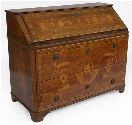 Antica ribalta lastronata e filettata, anta intarsiata a motivi stilizzati celante sportello e quattro cassettini. Fronte a due cassetti e fianchi intarsiati a motivi vegetali, rosoni e cavalieri (cm 118x97x54) (difetti e restauri)