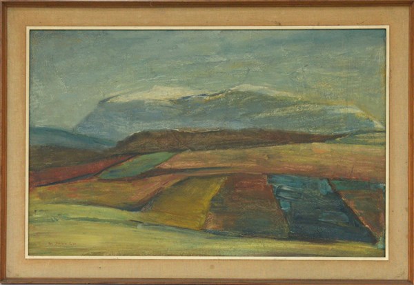 "La Pianura" olio su cartone telato (cm 56x88) firmato in basso a sinistra, in cornice (difetti)