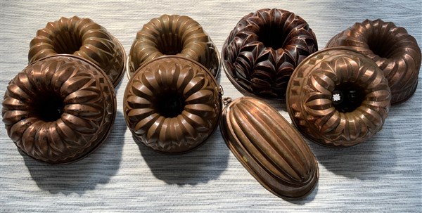 Gruppo di otto antiche forme per budino in rame di dimensioni differenti (difet