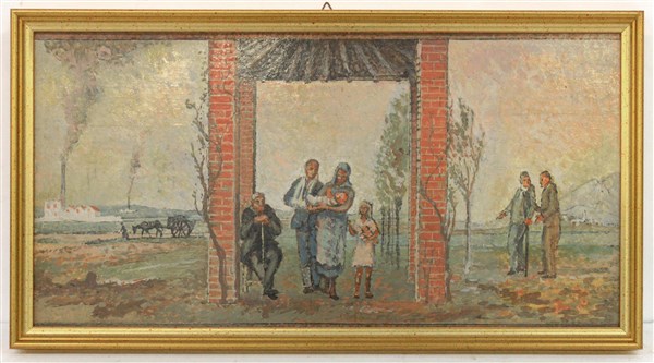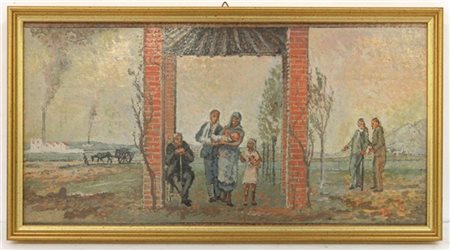 Ignoto del secolo XX "La famiglia" olio su faesite (cm 28x54) in cornice